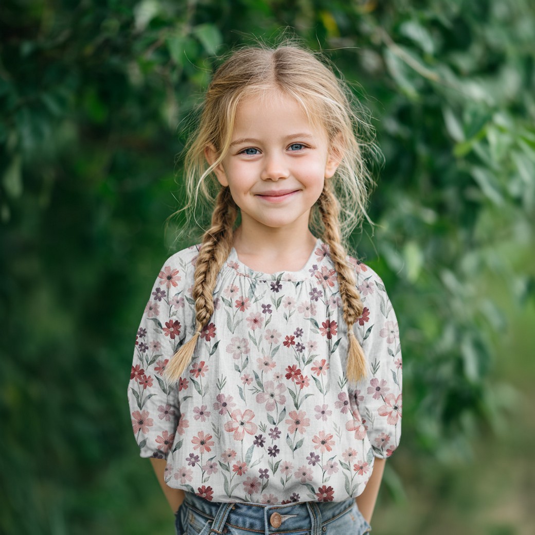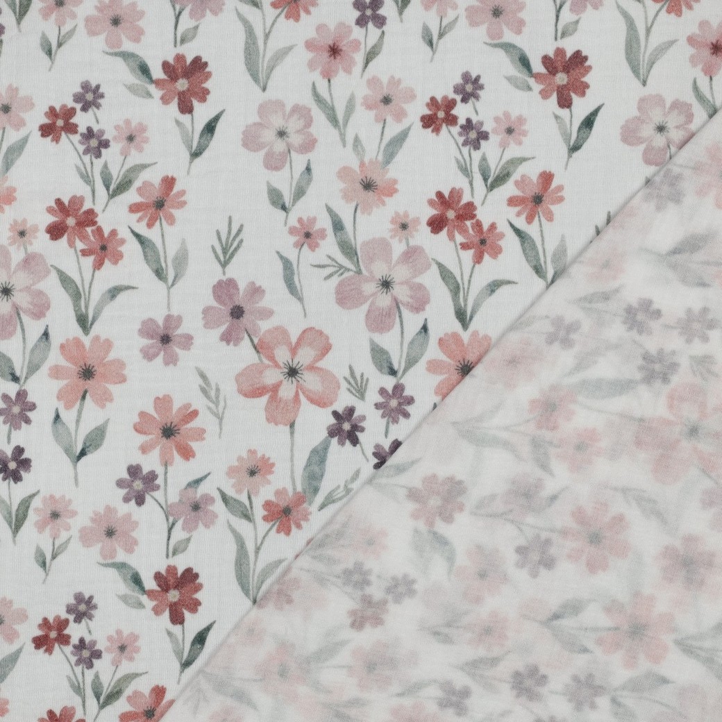 Pastelsetes toonides lilledega musliinkangas. Kahekordne musliin (Double Gauze) ehk puuvillakrepp, on kahekihiline kangas, mille parem ja pahem pool sama tooni.